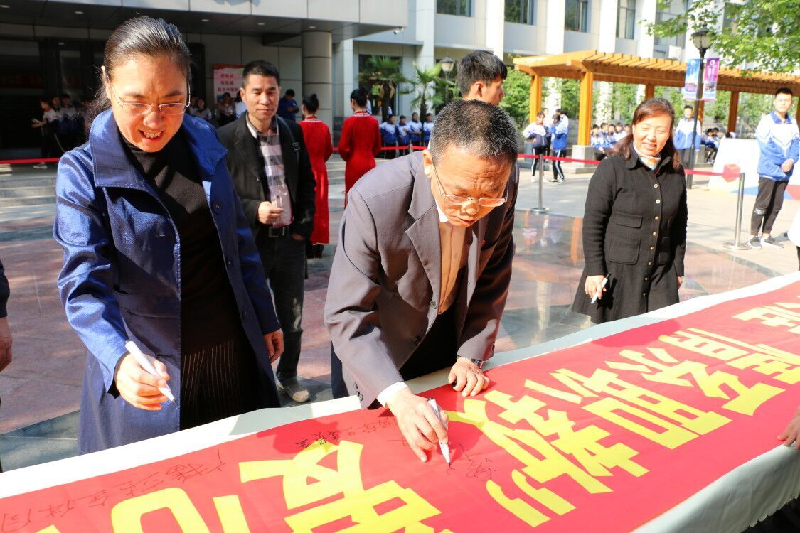 鲜艳的红色条幅在阳光下熠熠生辉,温情的旋律《爱的奉献》在耳边萦绕,学校师生们纷纷来到技能大道上,相聚在印有善行大队队徽的红色募捐箱前。学校校长王文利、校党委书记谭玉平、副校长张世民、苗红玉、李敬波第一批进行了爱心捐款,各部门主任及老师们紧跟着积极响应,各个班级派代表也进行了捐款。学校领导和师生们捐款后,在条幅上签下了自己的名字,并在寄语本上提写了寄语,留下美好的祝福。善行大队还为捐款的领导和师生们发放了精美的纪念品——带有善行大队LOGO的碳素笔和手机指环,以表达对此次善行善举的感谢。