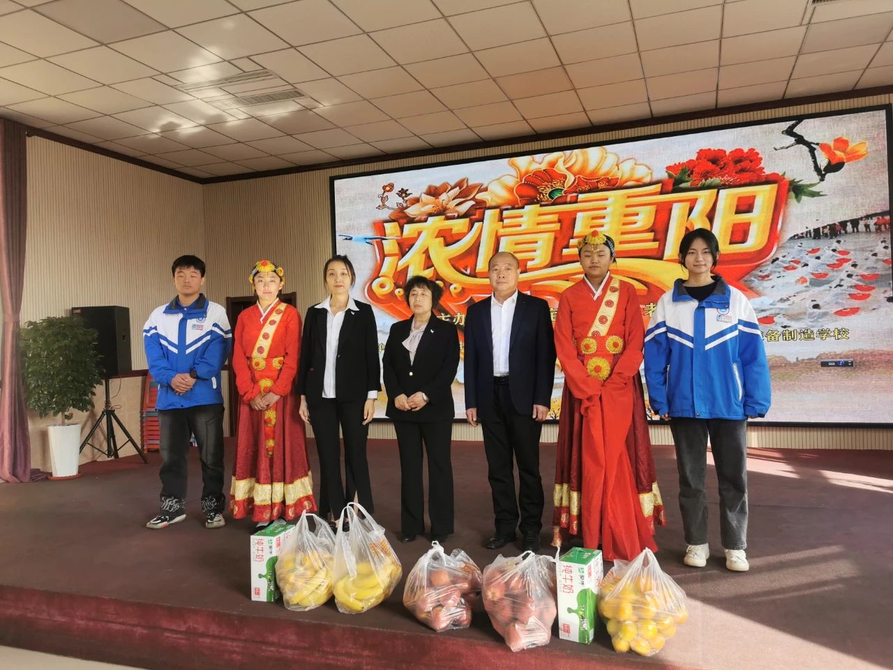 活动伊始,学校和敬老院领导分别作了讲话,并由学生代表为老人送上准备的牛奶、水果等礼品。随后,同学们为老人献上了精心准备的节目,台上载歌载舞,台下喜气洋洋,呈现出一派欢乐、喜庆的氛围。