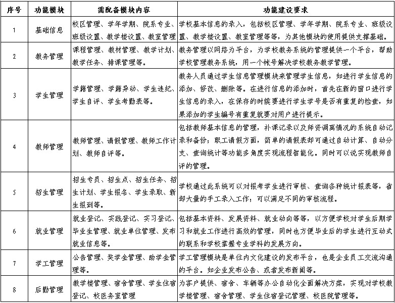 每个学生建立唯一登录ID,学生可以在平台上自主选课、成绩查询、查看课表、接收通知、了解信息、掌握动态、培训信息等。平台应包含教学管理信息系统、学生工作管理系统、就业管理系统、教师管理、招生管理、后勤管理等功能。