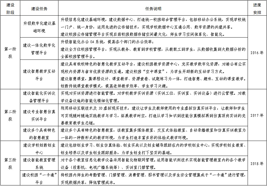 按照国家、省、市关于职业院校数字校园建设的有关部署,将建设数字校园列入学校2016-2020年五年发展规划。通过三年的建设,形成安全、稳定、环保、节能、教学相长的智慧化校园,在全省范围内形成示范、引领和辐射的积极效应。
