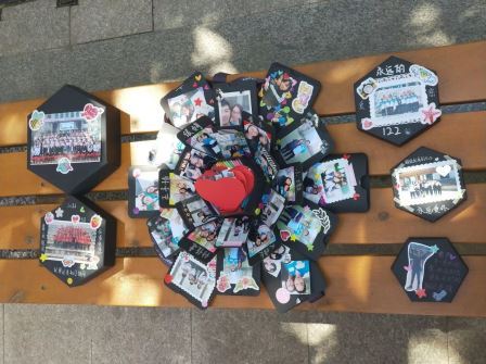 522,夜,操场。手机星光辉映下,通往爱之舞台的小路,45张合影一路陪伴。在舞台中央,灯光闪烁中,我的礼物盒静静地等候。带着惊诧与好奇,解开丝带,将红色爱心取出,里面是美丽的回忆。盒盖的正中,是我们的毕业照,随着一层层贴着合影、写着“爱你”的盒盖的开启,盛载我们满满爱意的礼物盒层层剥落,如盛开的雪莲花,每个花瓣上都有我与孩子们的合影,花蕊中是每个孩子写给我的毕业留言。一句句“爱你”,一份份祝福,一个个叮咛,一声声感谢。爱,已将我包围其中。