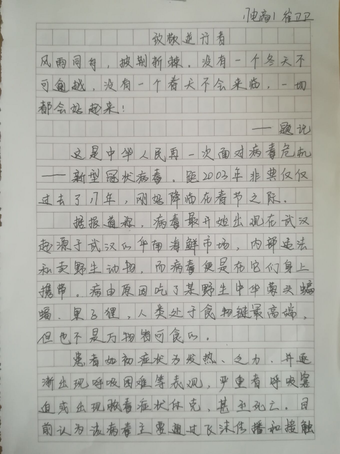 同学们用自己的绵薄之力向逆行者致敬。在非常时期,同学们减少了外出,但是全国各地的医护人员还奋斗在第一线,支援武汉抗击疫情,每一个医护工作者都是值得学习的对象,作为一名中职生,每一个同学都用“静”致敬那些坚守的、“逆行”的英雄们。同学们在笔尖发挥着自己的真情实感写出一篇篇文章,画出一幅幅手抄报向他们致敬。并录制抖音短视频为加油武汉!为抗疫英雄们点赞!