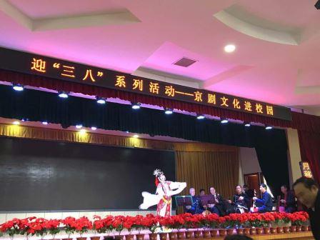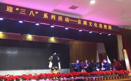 3月7日下午,石家庄市职教中心知行讲堂里鼓乐铿锵,京剧文化进校园活动在昂扬热烈的氛围中拉开了序幕。本次活动由学校工会和妇女工作委员会联合举办,是为全校女教工欢度女神节献上的一场文化盛宴。
