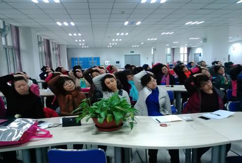 市中医院康复中心胡主任为广大教工讲述了中医按摩必备的知识——人体经络概况。同时针对教师群体中常见的颈椎病、肾虚、泌尿生殖系统疾病做了具体的穴位按摩指导。